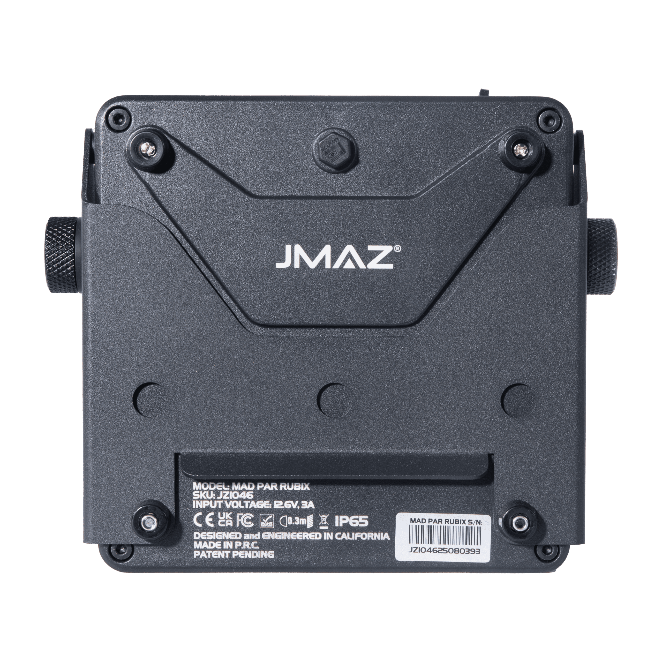 The JMAZ MAD PAR RUBIX is a versatile 20W RGBA + 18W (36 x 0.5W) RGB+WW SMD LED battery-powered outdoor uplight, offering stunning lighting effects with 73 preset color programs, 50 sound-active modes, and 72 auto/fade options. Its IP65 rating ensures durability outdoors, while its adjustable beam angles (20°/40° with diffuser) and Outer SMD LED: 120° Beam Angle creatives flexibility. Enjoy up to 14 hours of runtime (40 hours in battery-saving mode) with a 4-hour recharge time. Wireless DMX and IR remote compatibility make it easy to control, and it includes an IR remote, diffuser filter, A/C charger, and manual. Perfect for vibrant, reliable outdoor lighting.